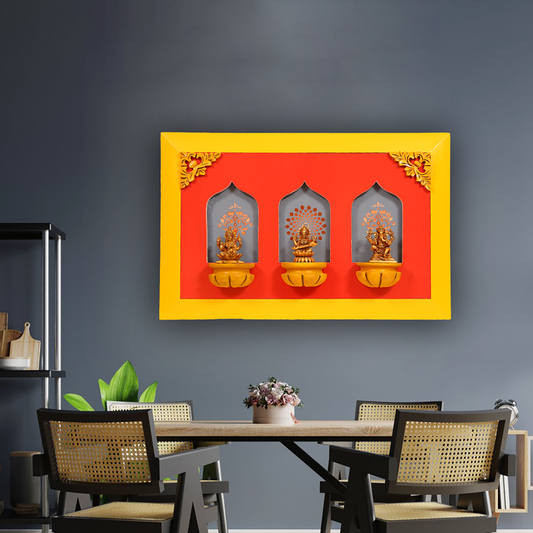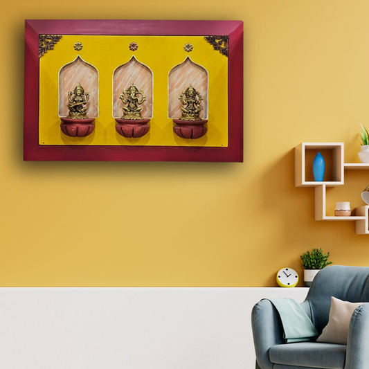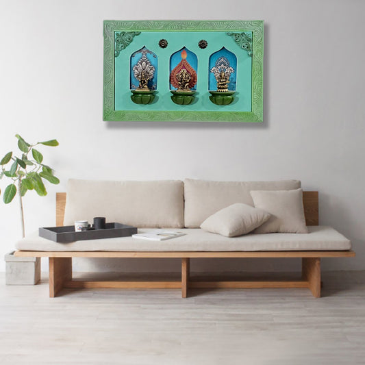Brass Idols of Sarasvati, Ganesh, and Lakshmi with Stunning Wooden Frame Background Painting